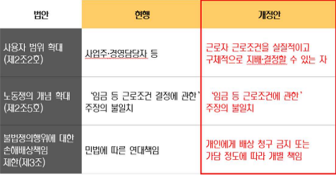 원청을 사용자 범위에 포함해 하청노동자의 교섭권을 강화하려는 법안입니다.